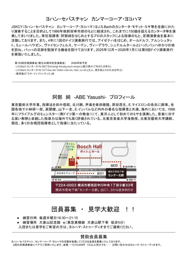 J.S.Bachのカンタータ・モテット・ミサ等を全曲にわたり演奏することを目的として、1986年故前田幸市郎のもと結成された当団は、おかげさまで創立40周年を迎えることができました。これを記念し、第103回定期演奏会の曲目解説講座を開催いたします。また、当団のこれまでの歩みもご紹介します。