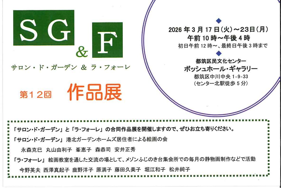 サロン・ド・ガーデン&ラ・フォーレ10:00~16:00(初日は12:00から、最終日は15:00まで)ギャラリー「サロン・ド・ガーデン」と「ラ・フォーレ」との合同作品展(絵画)の開催です。