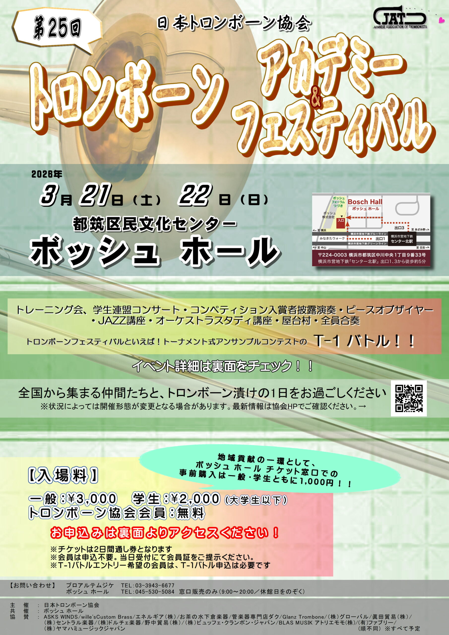 フェスティバルでは、トーナメント式のコンテスト「T-1バトル」をはじめ、学生連盟コンサート、入賞者披露演奏。POY2026演奏審査、全員合奏と盛りだくさんです。リハーサル室では、楽器店の展示会「屋台村」もあります。詳しくは日本トロンボーン協会ホームページをご覧ください。 -