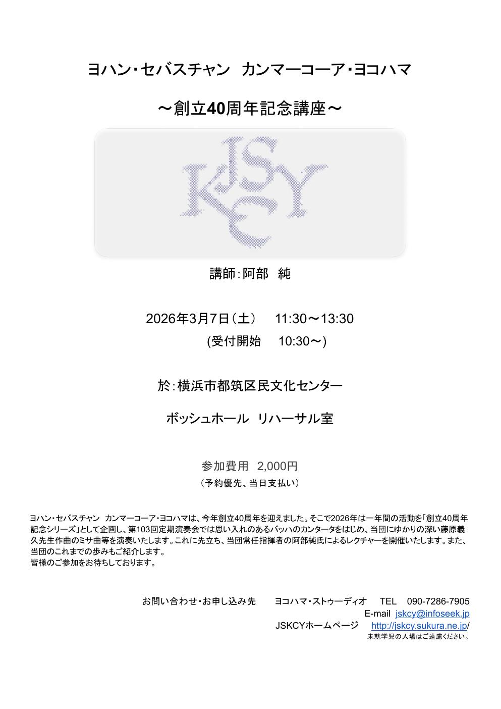 カンマーコーア・ヨコハマ創立40周年記念講座10:30開場/11:30開演リハーサル室J.S.Bachのカンタータの曲目解説 他